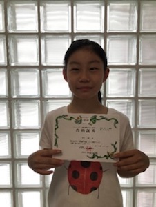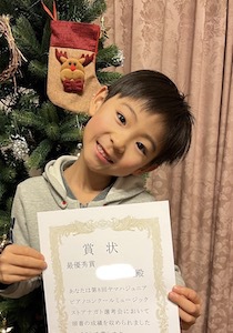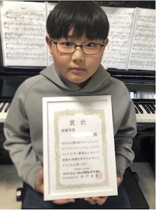 最優秀賞をいただいて本当に驚きました。がんばって挑戦してよかったね。これからも楽しんでピアノを弾いてね。先生、いつも根気強く丁寧にご指導いただきありがとうございます。これからもよろしくお願いします。