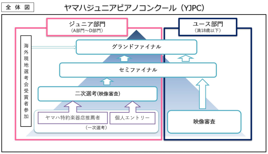 幼児科→ジュニア科→ジュニア専門コースハイクラス→ジュニア専門コース専攻クラス→ジュニア専門コース研究クラス、ピアノ個人